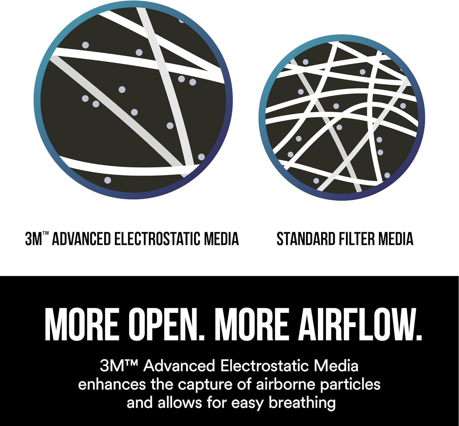 • 3M ADVANCED ELECTROSTATIC MEDIA enhances the capture of airborne particles and allows for easy breathing