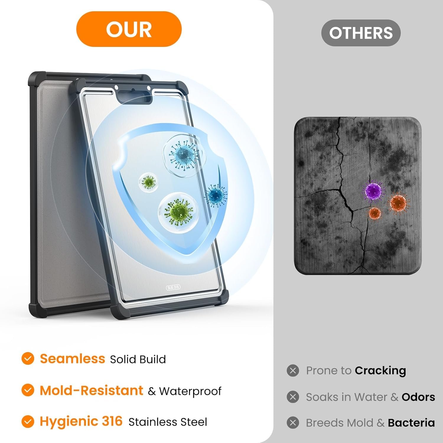 - Extra Large Cutting Area – 16.9″ x 11.8″ large stainless steel cutting board Enjoy ample space for chopping, slicing, and prepping multiple ingredients at once on our extra large cutting board, designed for busy families and serious cooks.