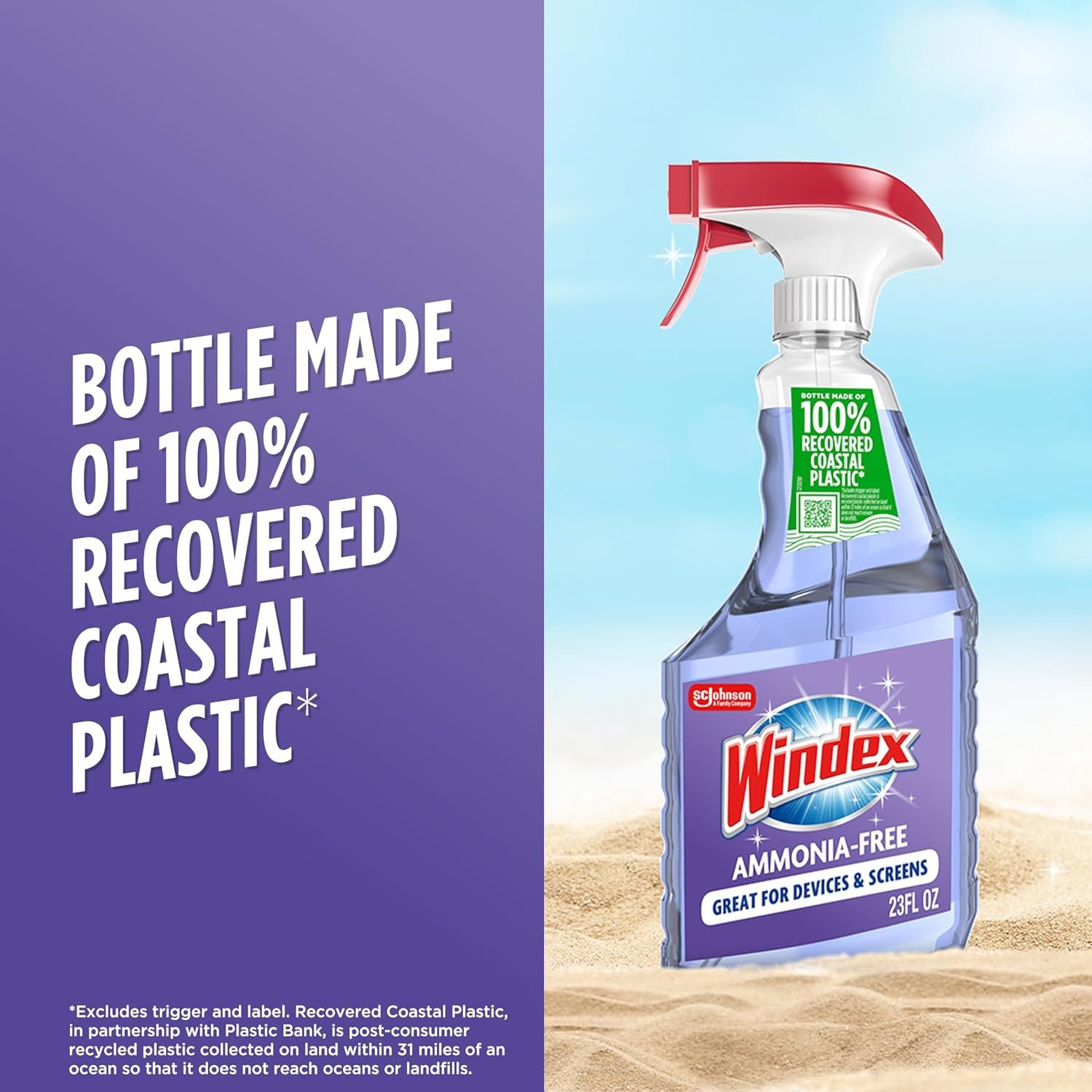 - Windex Commitment: spray bottles made from 100% recovered coastal plastic* in partnership with Plastic Bank, is post-consumer recycled plastic collected on land within 31 miles of an ocean so that it does not reach oceans or landfills.
